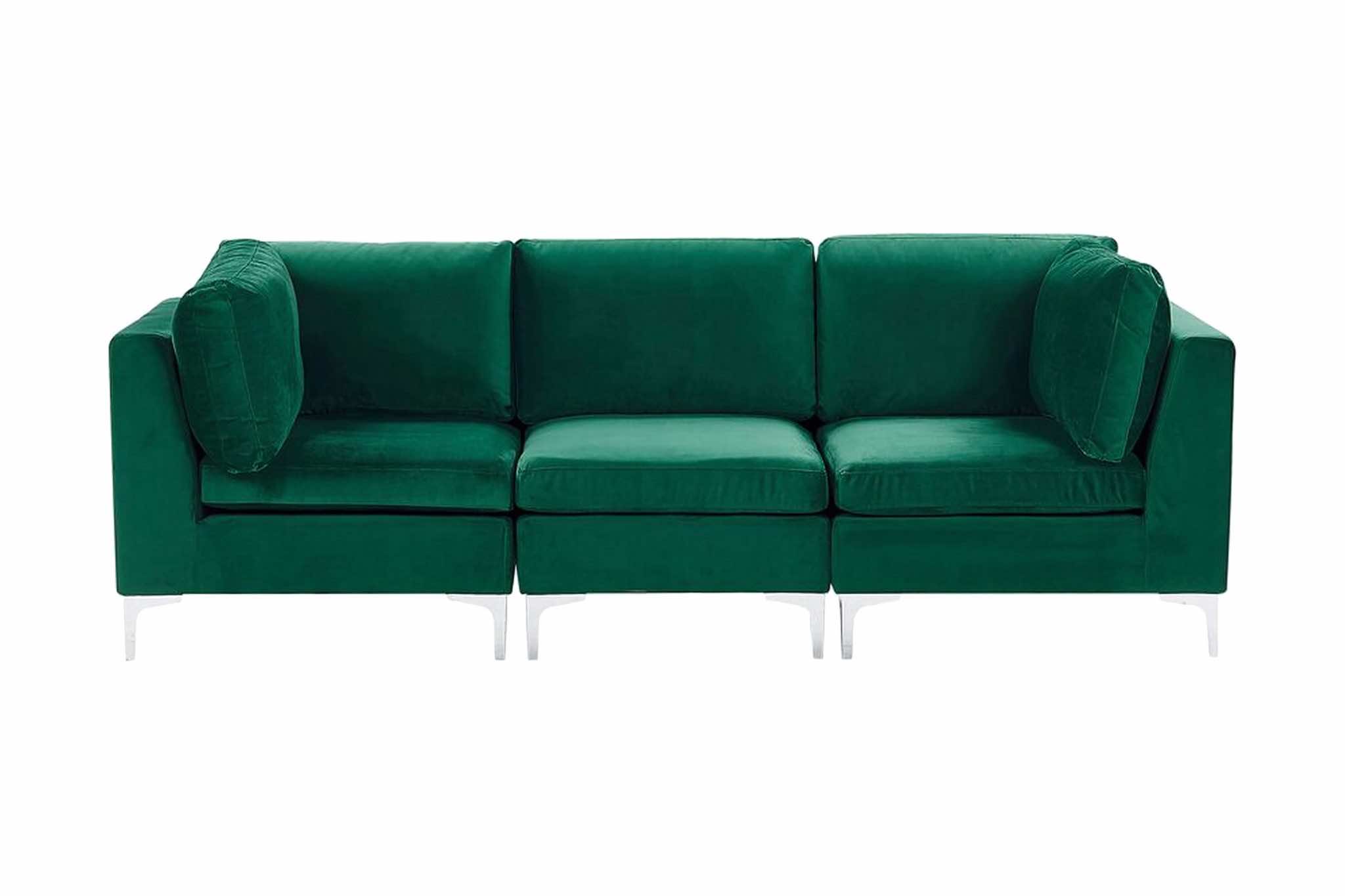 Skaffa dig en modulär soffa som gör att du kan justera sittplatser när du vill. Blanda och matcha fyra delar för att bygga en möbel som passar perfekt till ditt vardagsrum. Mångsidiga platser kan skapa ett vänster eller höger hörn. Varje element kommer med tjockt fyllda kuddar inneslutna i sammetklädsel. I kombination med glansiga silverben för ett rent, modernt utseende kommer den här soffan att bli en fantastisk mittpunkt i ditt vardagsrum. Material: sammet. Ytterligare material: metall, eukalyptusträ. Materialkomposition: 100% polyester Vikt: 52 Kapacitet: 3 personer Montering: Delvis montering krävs Benhöjd: 15 Stoppning tjocklek: 16 Sitthöjd: 48 Produktfördelar: Möbeltassar skyddar golvet mot repor, Modern, exklusiv design, Modulerna kan enkelt kombineras för olika stilar, ryggkuddar med avtagbara fodral, Täckt ed tyg på alla sidor