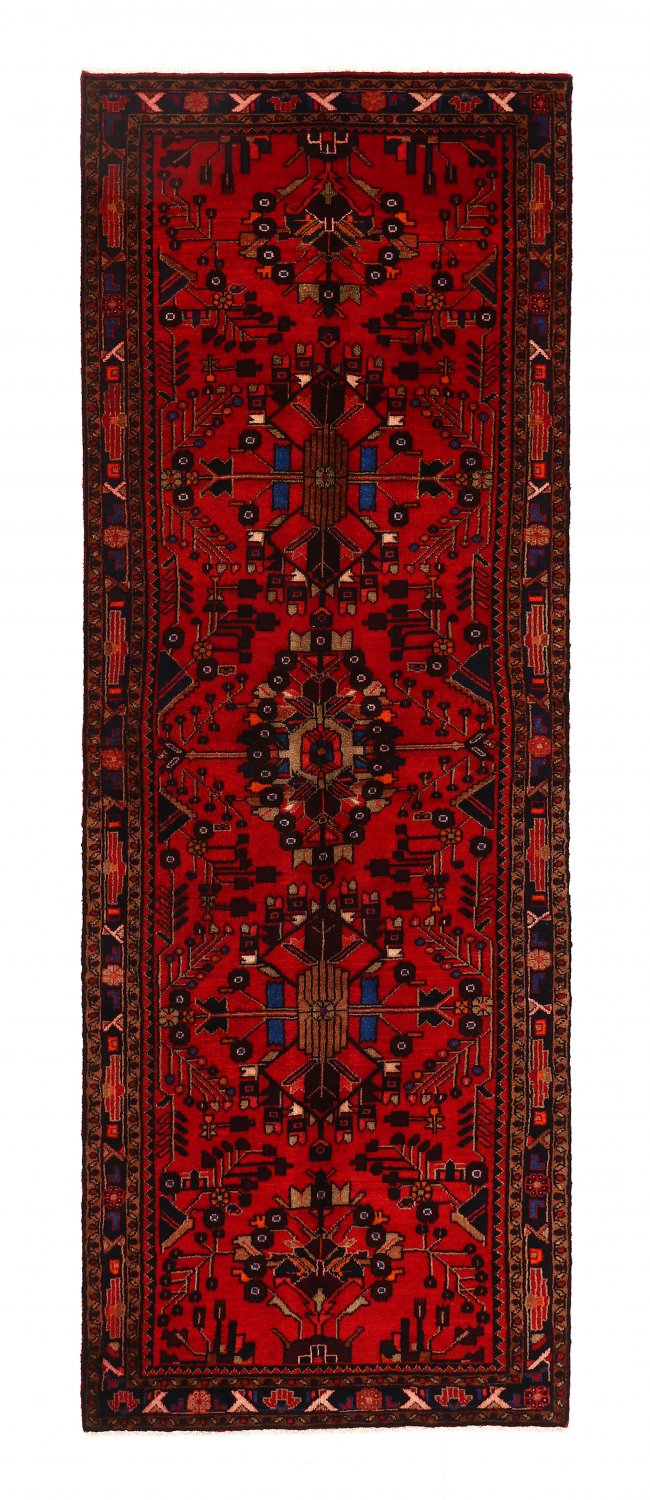 Hamedan‑mattor kännetecknas av sina tydliga geometriska mönster och ofta en framträdande medaljong. Den täta ullluggen och det handknutna utförandet ger en tålig matta som står sig väl i vardagsrum, hall och matsal. Den klassiska designen kombinerar traditionellt hantverk med en modern känsla och blir ett naturligt blickfång i hemmet.