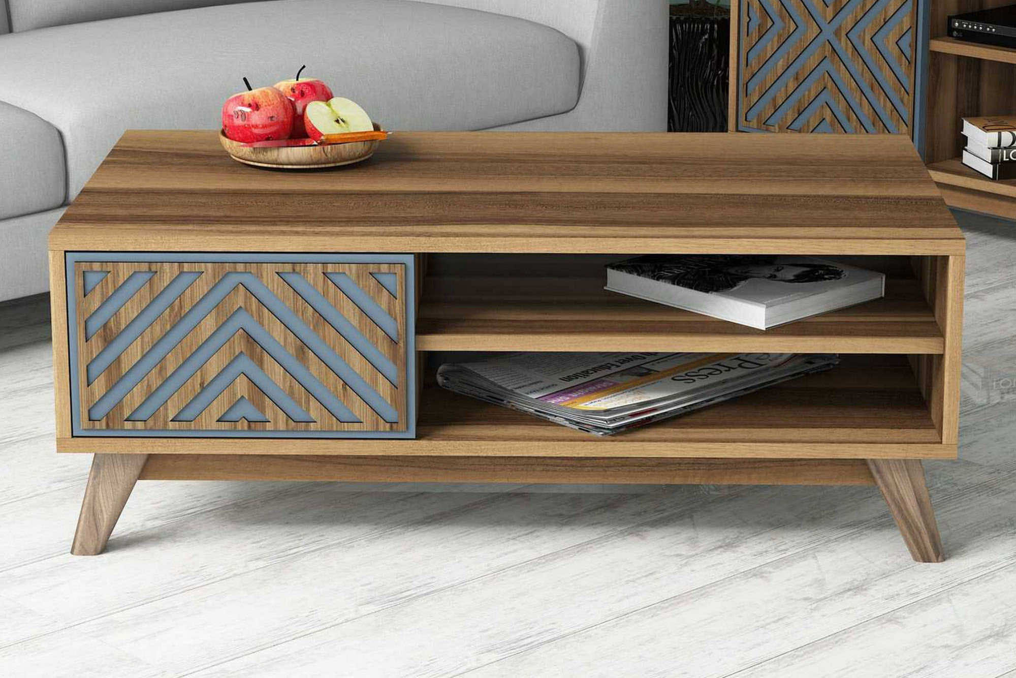 Soffbord Amtorp 105 cm med Förvaring 2 Hyllor Linjer + Skåp – Blå/Brun