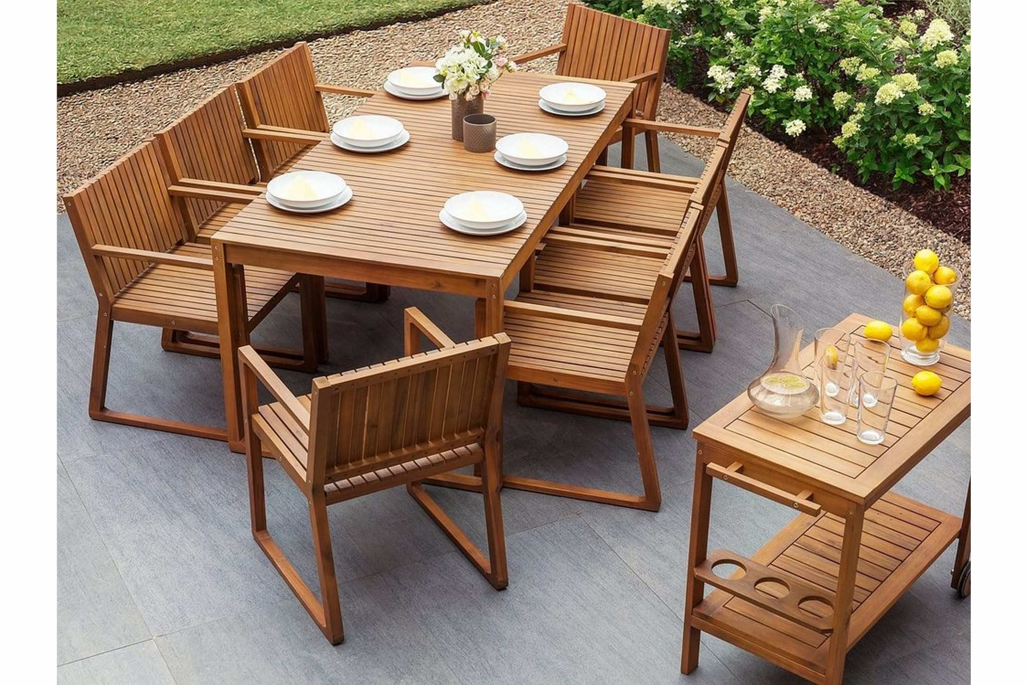 Presenterat trädgårdsmöbelset är perfekt för 6 personer. Enkel men elegant form och färg understryker setets funktionalitet. En serveringsvagn med hjul som ingår i erbjudandet är extremt praktisk och kommer att vara nyttigt under en större fest eller grillning med vänner. Möblerna är tillverkade i akaciaträ som är motståndskrafttigt mot fukt och ändrade väderförhållandena. Material: akacieträAcacia mangium). Vikt: 102 Kapacitet: 6 personer Montering: Fullständig montering krävs Arter: Acacia mangium x auriculiformis Ursprung trä: Vietnam Bordens mått: 180x90x75 Sidobordsdimensioner: 83x47x74 Stolens mått: 54x59x80 Produktfördelar: Perfekt anpassade armstöd, Designad speciellt för utomhusbruk, Precist utförande, Modern, exklusiv design, Gott utrymme för förvaring Skötselråd Utemöbler Skötselråd Utemöbler Skötselråd Utemöbler Skötselråd Utemöbler